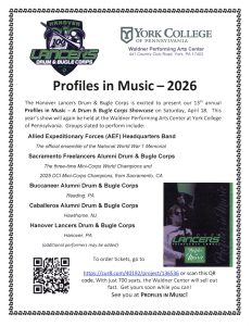 The Hanover Lancers Drum & Bugle Corps proudly present Profiles in Music – 2026. Join us for a night of incredible music at the beautiful Waldner Performing Arts Center on the campus of York College. This show sells out – purchase your ticket today.
