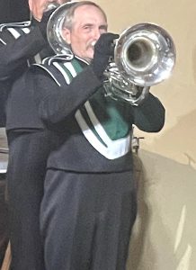 I began drum lessons before the age of 10 with Walt Mitzel at Menchey’s on Saturday mornings. My dad started the Cannoneers Junior Drum and Bugle Corps in the mid 1960’s. My first year I carried a rifle in the honor guard, since I was too small to carry a drum. My second year I played third soprano, and my last two years I played French Horn. Many Cannoneers moved on to the Lancers, whom we admired greatly. I came to a Lancers rehearsal in 1994 or 1995 for a Sunday afternoon date with my girlfriend (now wife) and was handed a mellophone. I played that for about ten years and then moved to the drum line. I played straight bass, then rudimental bass until a sabbatical for a few years and now have been playing straight bass again. I have hip issues, so I may return to parades in the honor guard, but will continue in the drum line for concerts. I am a third-generation accountant nearing retirement, and I serve on 5 non-profit boards. We were taught by ear in the 60’s, so my good friend and fellow mellophone Andy Crouse would number my Lancers music for me. My scariest gig – when we marched in the Taneytown parade and I was the only mellophone (out of 9) and we played Star Wars. Fortunately, my old Cannoneer mate, Mike Carver, played the mellophone solo on his soprano in that parade!